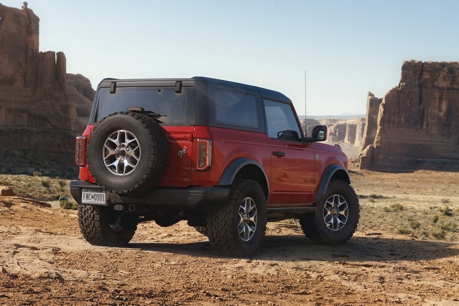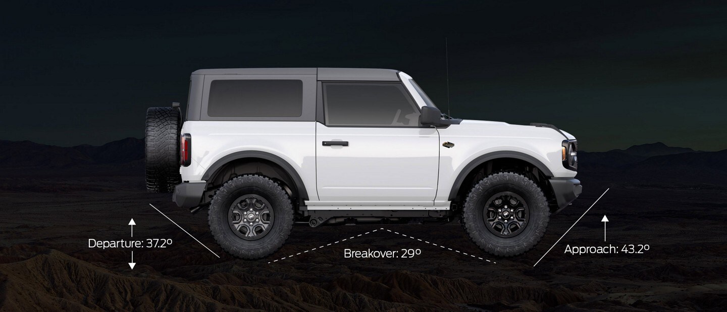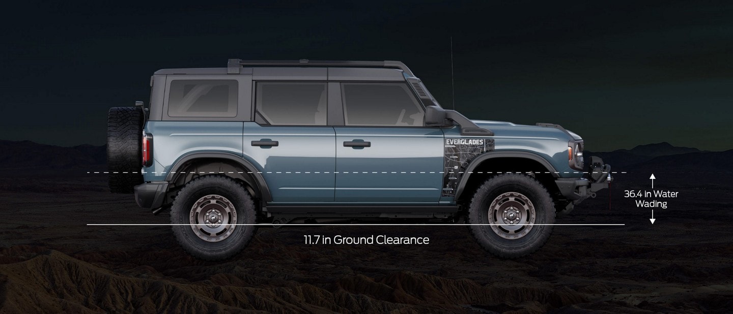 Always consult the Owner's Manual before off-road driving, know your terrain and trail difficulty, and use appropriate safety gear. Removal of doors for off-road use only. See Bronco Owner's Manual for detailed information.